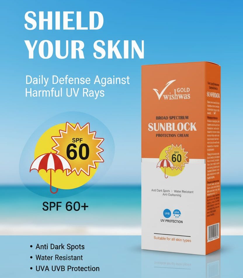 Shield your skin from harsh sun damage with Wishwas Gold SPF 60+ Sunblock. This high-performance, broad-spectrum formula provides powerful protection against UVA/UVB rays, preventing sunburn, premature aging, and tanning. Enriched with nourishing ingredients, it creates a protective barrier without clogging pores or leaving a white cast. Keep your skin safe, hydrated, and youthful-looking all day long.